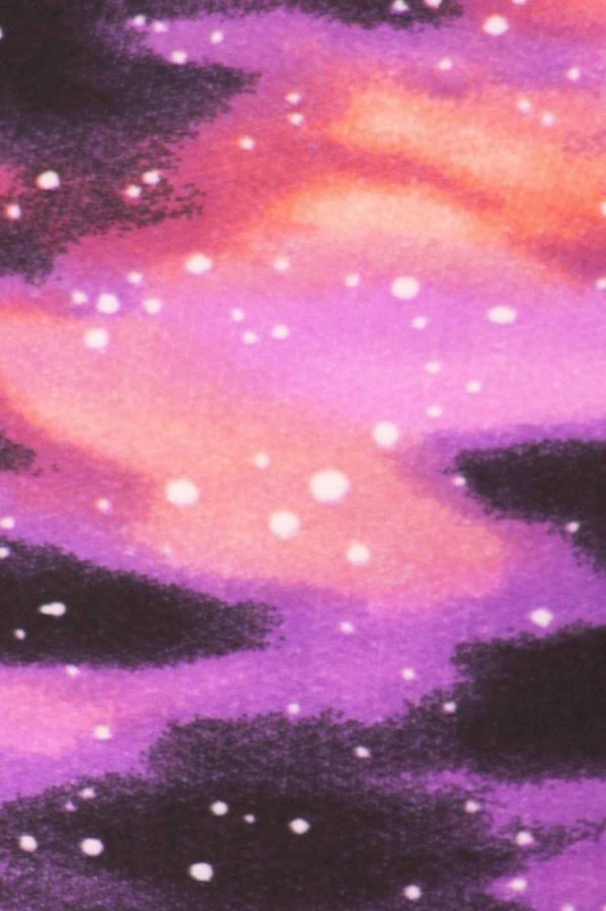 Imported Cool Night Sky Purple Print Leggings Sassy Bell Bottom Cut with High Waist Finish Ultra Soft and Comfy Milk Silk Fabric 92% Polyester 8% Spandex Model is wearing a Small Measurements are 39D x 33 x 40 and height is 5' 7" (170.2 cm) Hand Wash or Professional Wash