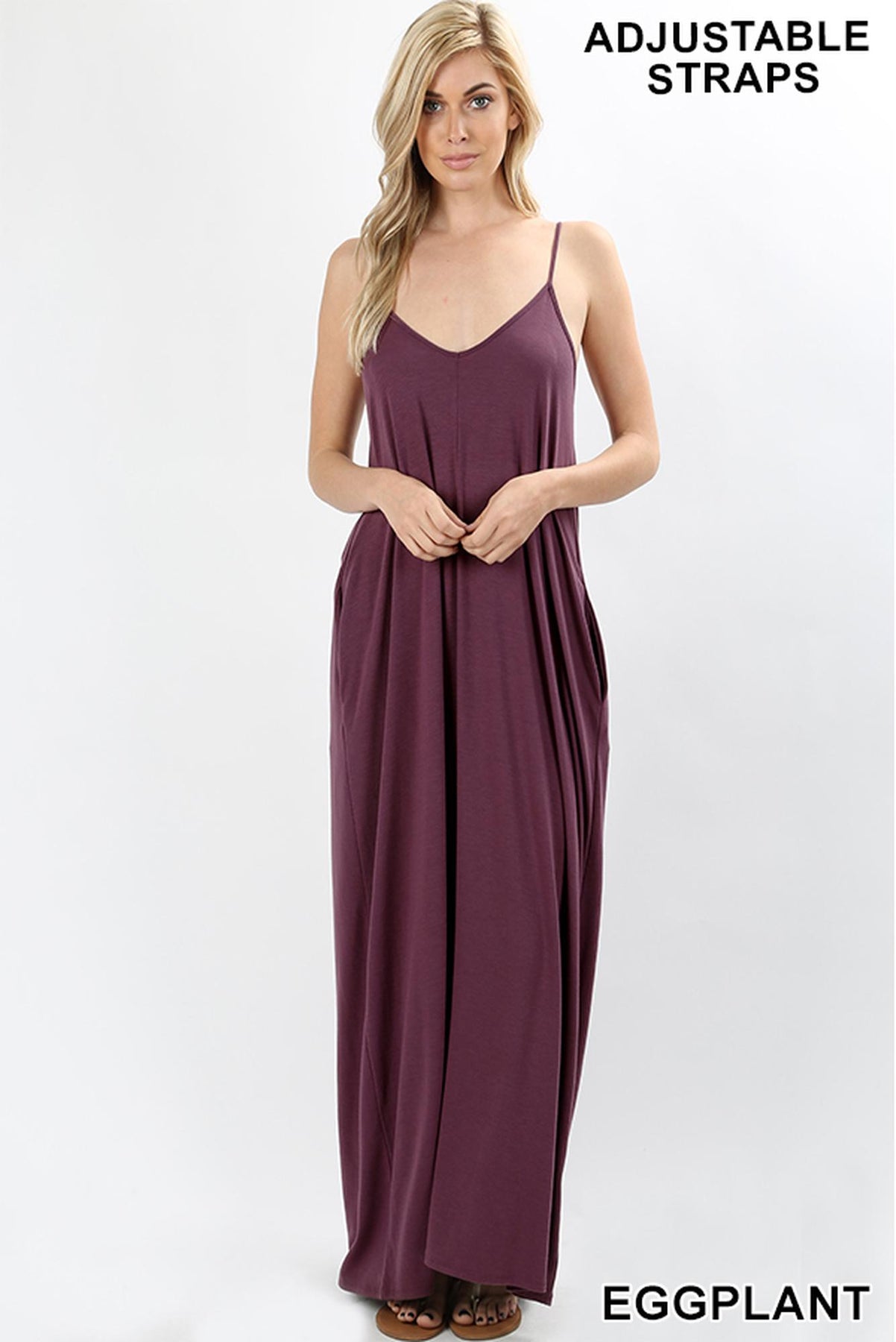 Imported Premium Spaghetti Strap Dress with Rayon Fabric Blend Gorgeous Loose Fit V-Neck Maxi Dress with and Pockets Easy Fit with Adjustable Straps A Wonderful Stand Alone Piece Easily Complimented with Leggings 55% POLYESTER 40% RAYON 5% SPANDEX Model is Wearing a 1XL Measurements are 38DD x 36 x 44 and height is 5' 9" TOTAL BODY LENGTH: 51" CHEST: 42" approx. Measured From a 1XL Hand Wash, Professional Wash or Machine Wash Delicate