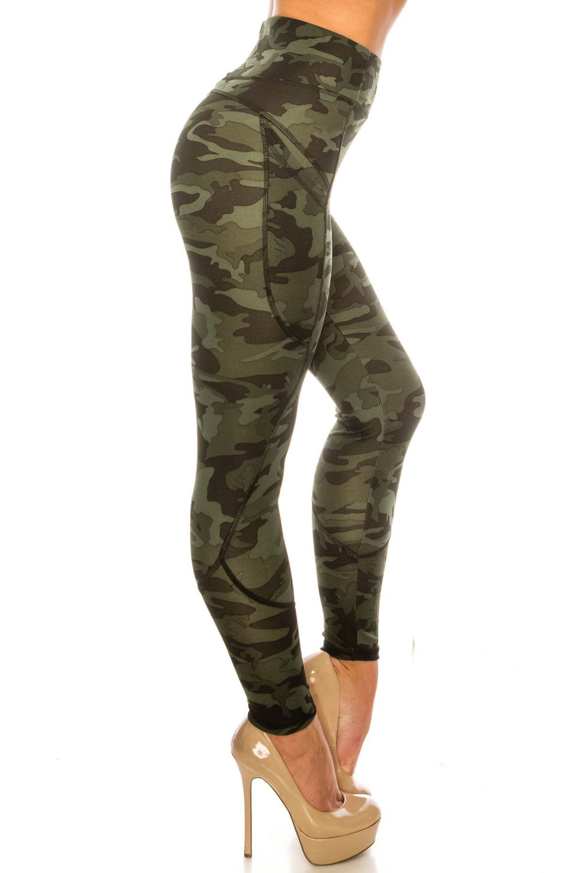Wholesale Dark Olive Camouflage Contour Seam High Waisted Sport Leggings with Pockets