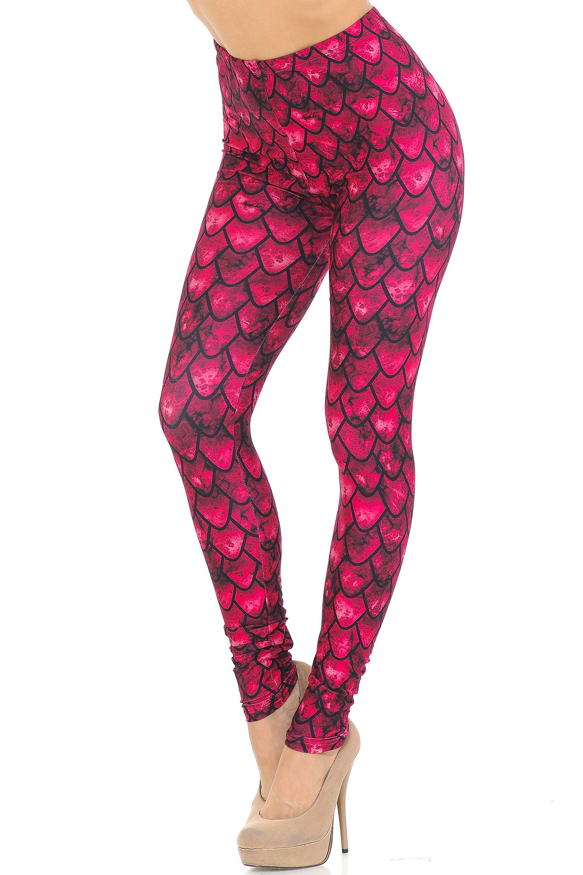 Imported Extra Small Fits Sizes Below 0 - Weight: 75 - 95 LBS Red Leggings with Scale Print Has the Effect of Mermaid Scales, Fish Scales, and Dragon Scales USA Fashion™ Signature Collection Premium Creamy Soft Milk Silk Fabric Double Brushed 200 GSM Fabric Weight 92% Polyester 8% Spandex Model is wearing a One Size Measurements are 32B x 24 x 36 and height is 5' 6" Hand Wash or Professional Wash USA Fashion