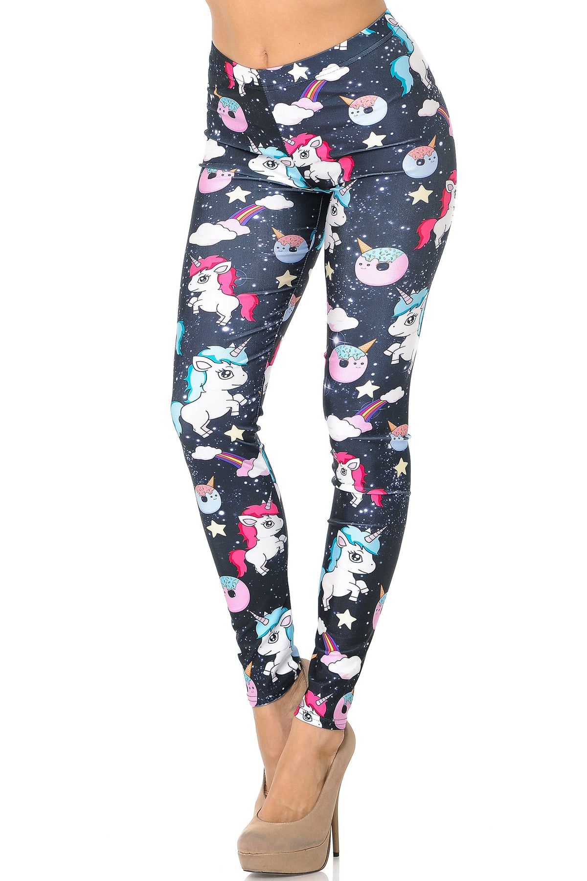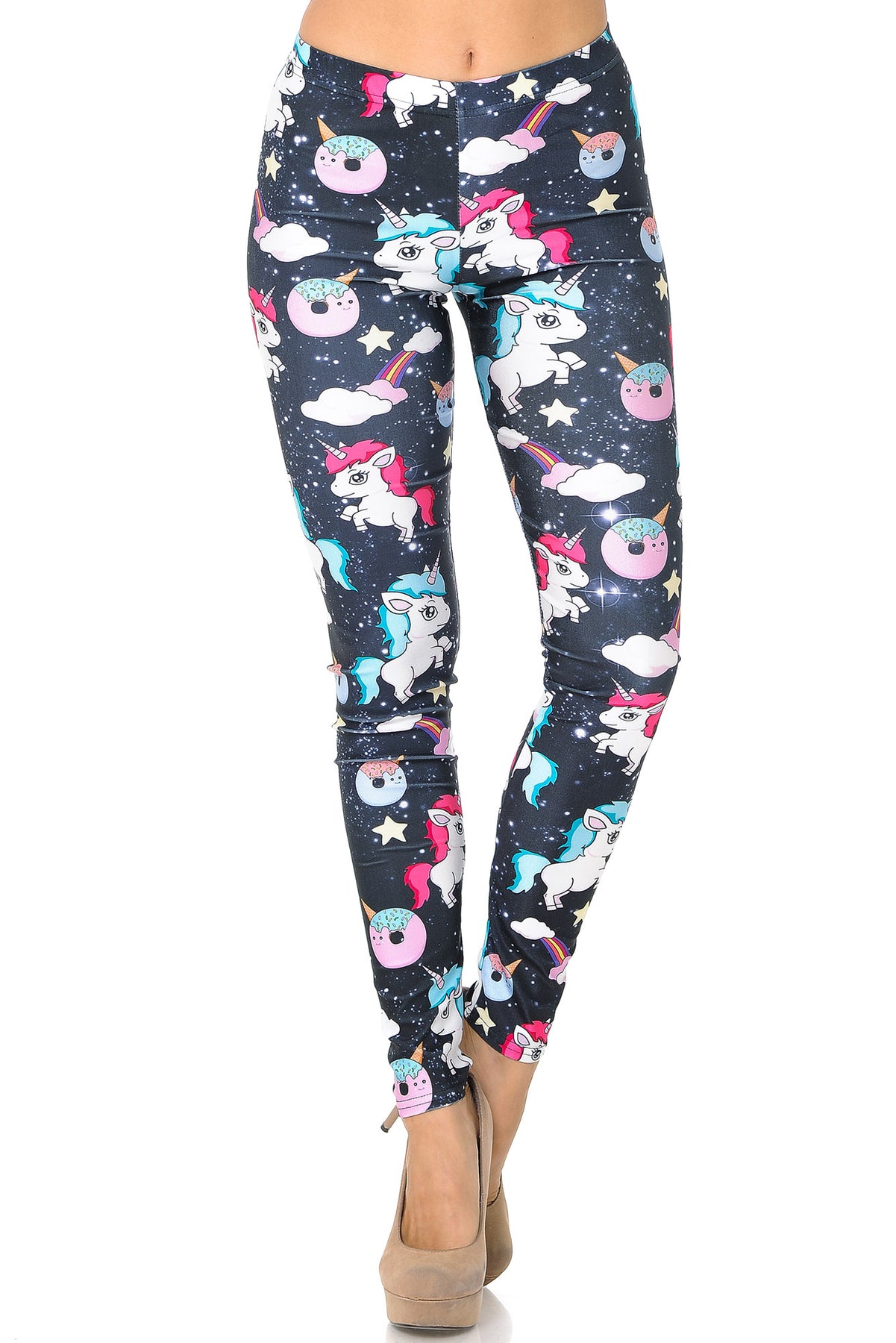 Imported Black Milk Style Smooth Shiny Fabric A Fabulous Galaxy, Unicorn, Rainbow and Glazed Doughnut Fabric Design Full Length with Comfort Elastic Waistband 88% Polyester 12% Spandex Model is wearing a Small Measurements are 32B x 24 x 36 and height is 5' 6" Hand Wash or Professional Wash