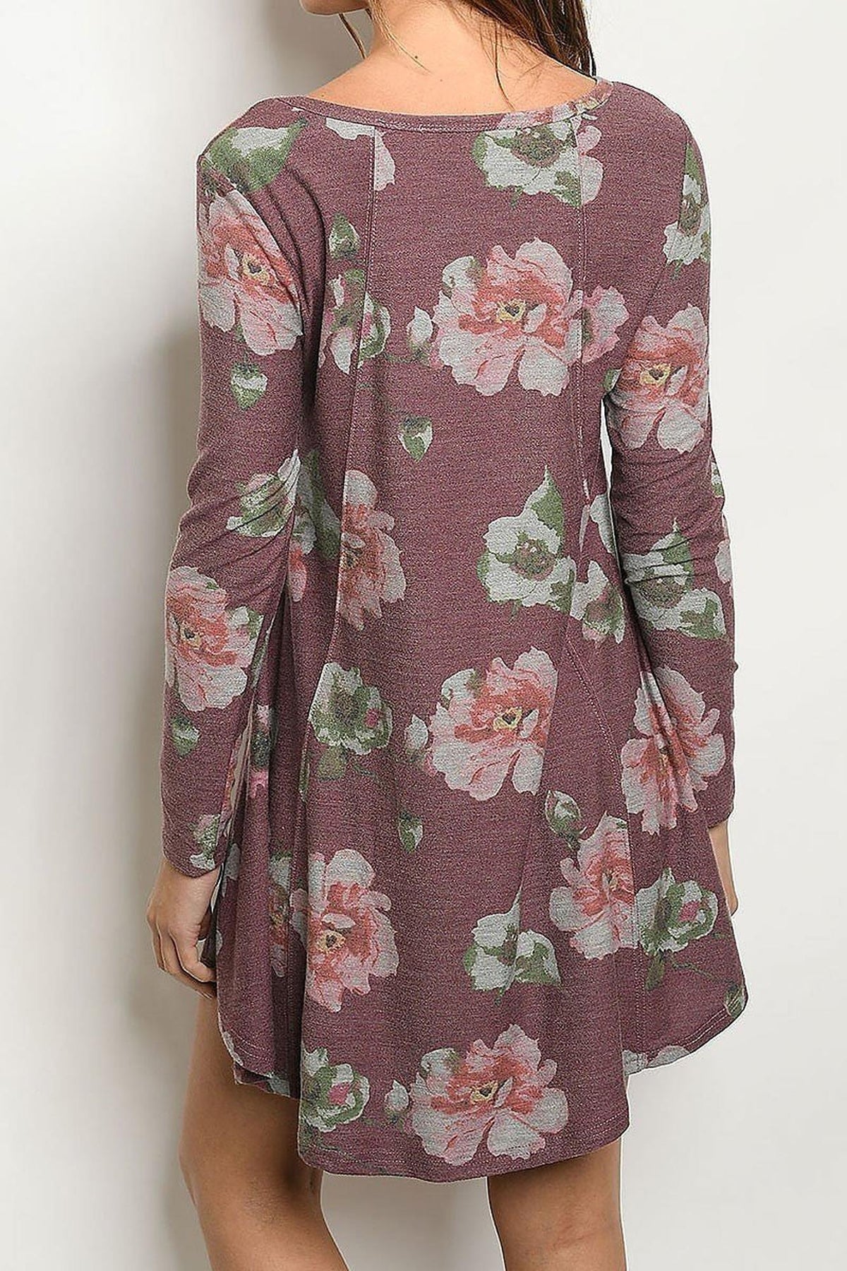 Imported A Gorgeous Loose Fitting A-Line Floral Print Mini Dress with Long Sleeves and Round Neck Finish in Burgundy or Navy Features a Beautiful Flower Design with a Cool Weathered Vintage Look A Wonderful Dress for Any Season that Can be Layered with Tights During Fall or Winter 70% Polyester 26% Rayon 4% Spandex Model is Wearing a Small Measurements are 34C x 26 x 34 and height is 5' 9" Length: 34 Bust: 36 Waist: 40 Hand Wash, Professional Wash or Machine Wash Delicate